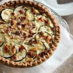 Bacon, Cheddar, Zucchini Quiche! This savory quiche is brimming with crisp, smoky bacon, gooey cheddar cheese and fresh zucchini, comes together in minutes and can be served hot or chilled.